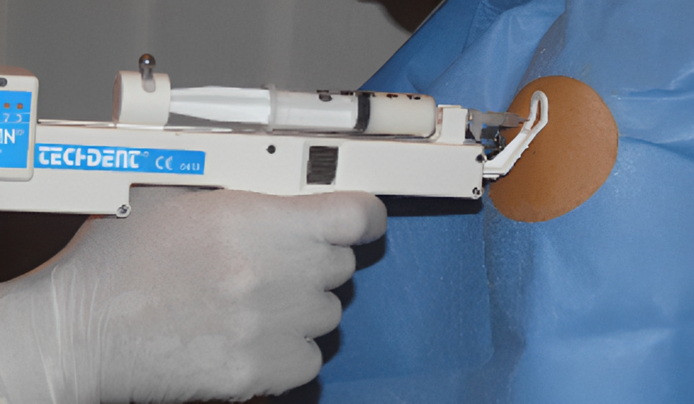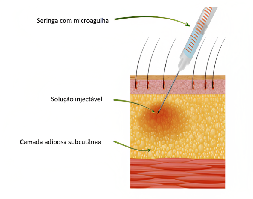 Mesoterapia com pistola de microinjectores automáticos e previamente programados. Esta técnica permite uma aplicação terapêutica em zonas extensas, com uma expulsão de quantidades rigorosamente iguais da solução farmacológica por injeção.